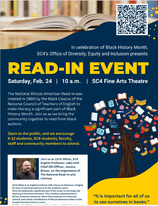 St. Clair County Community DEI office will host a Read-in Event for our k-12 students. Each student will be reading books from African American Authors. This event is open to the public and encourages SC4 students, faculty, staff, and community members to attend.