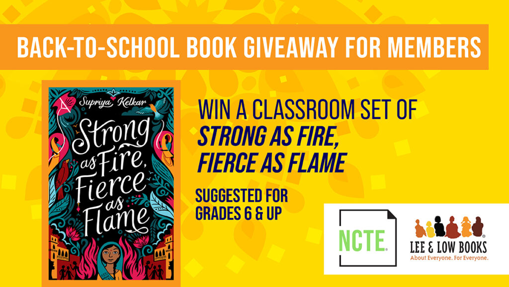 One hundred NCTE members will be selected to receive a classroom set of forty-eight copies of Strong as Fire, Fierce as Flame by Supriya Kelkar. The book is suited for readers in grades 6 and up, so middle and high school teachers are especially invited to enter the giveaway.