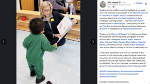 Many event hosts have been participating in this annual celebration for a decade or longer. On the Literacy & NCTE blog, AARI Coordinator Talika Mock-Green shared how each year at her South Carolina school, Bells Elementary, preK through fifth grade students spend a day reading African American-centered stories. Additionally, the National Hook-Up of Black Women (NHBW) hosts read-ins and open mics, where local African American writers showcase their work.
