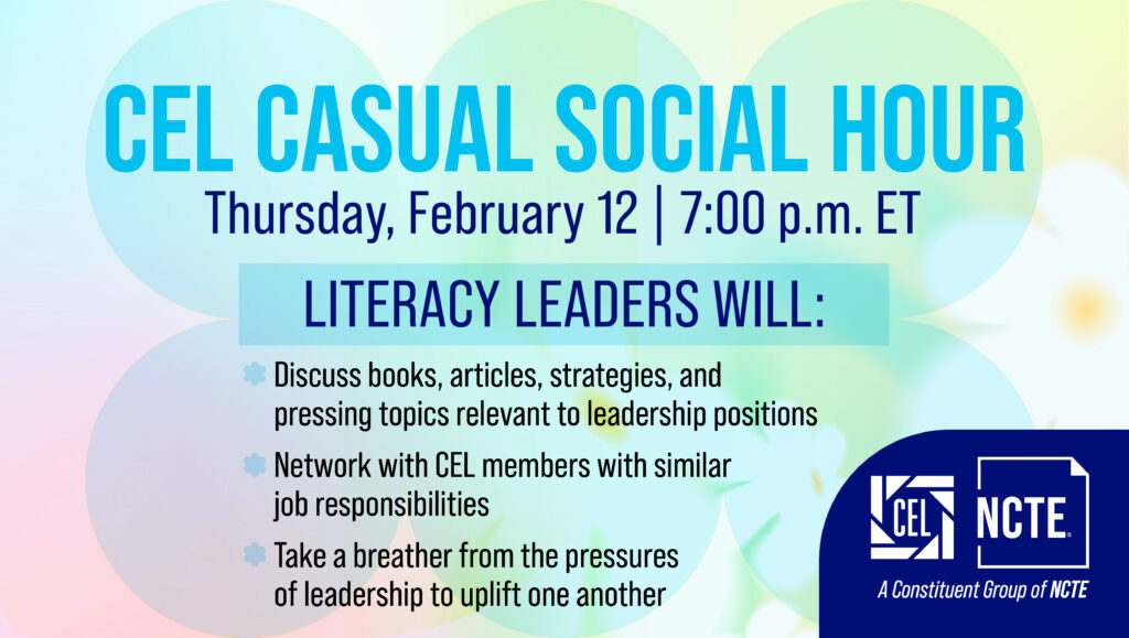 The Conference on English Leadership (CEL) invites CEL members to join a virtual Social Hour on February 12. This casual session will provide an opportunity to connect, troubleshoot, and share strategies around literacy leadership.