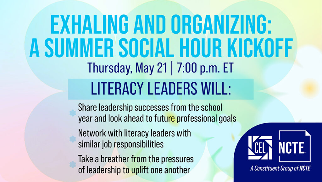 The Conference on English Leadership (CEL) invites NCTE members to join a virtual Social Hour kicking off the 2026 summer break. This session will provide an opportunity to connect, share successes, and set future professional goals around literacy leadership.