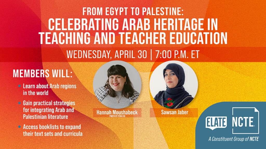 NCTE members are invited to join English Language Arts Teacher Educators (ELATE) and Hannah Moushabeck and Dr. Sawsan Jaber in celebration of National Arab American Heritage Month. This enriching event will uplift Arab literature and culture, with a particular focus on Palestine.