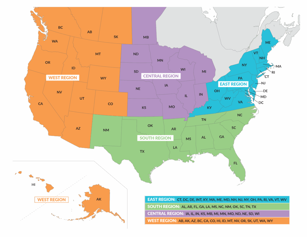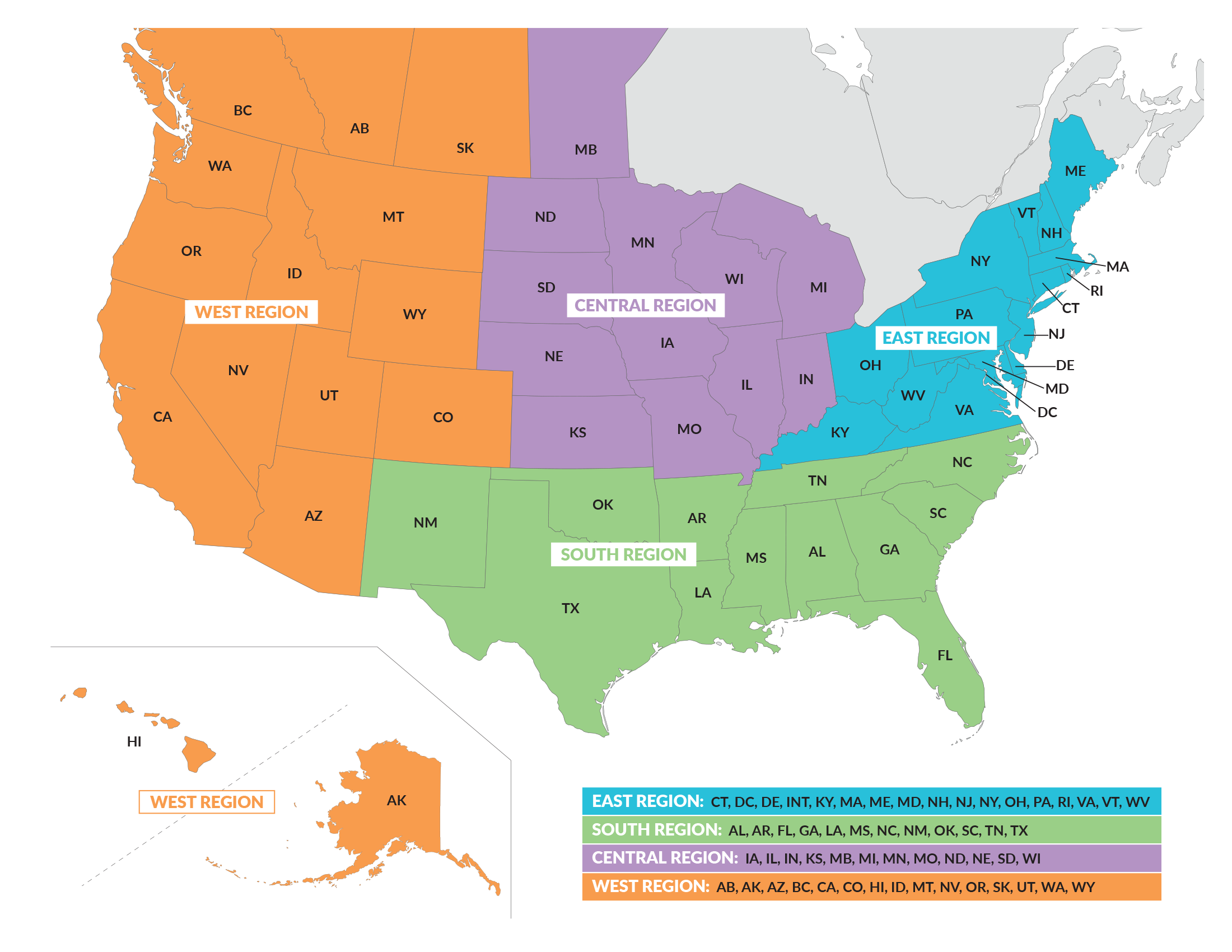 West Region: AB, AK, AZ, BC, CA, CO, HI, ID, MT, NV, OR, SK, UT, WA, WY