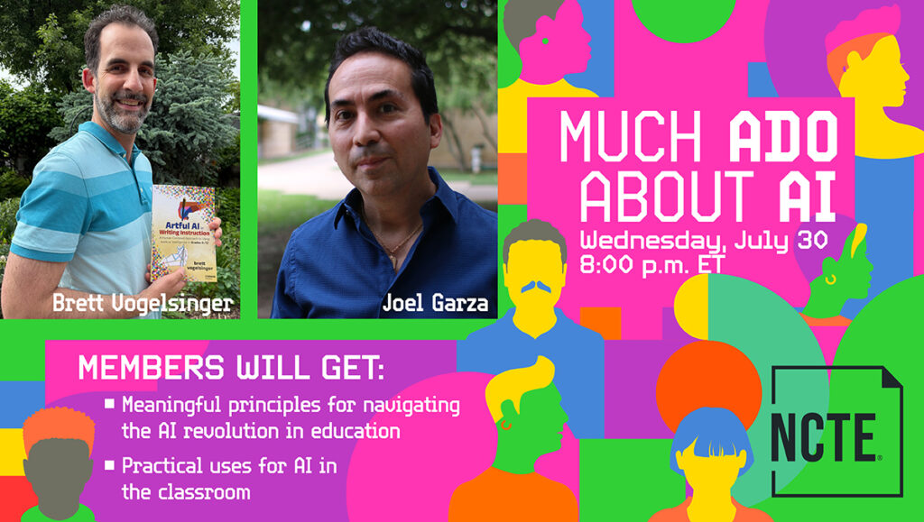 NCTE’s Secondary Section invites members to join Brett Vogelsinger, author of Artful AI in Writing Instruction, and Joel Garza, Secondary Section Steering Committee member, for a conversation about how our profession is using and thinking about AI.