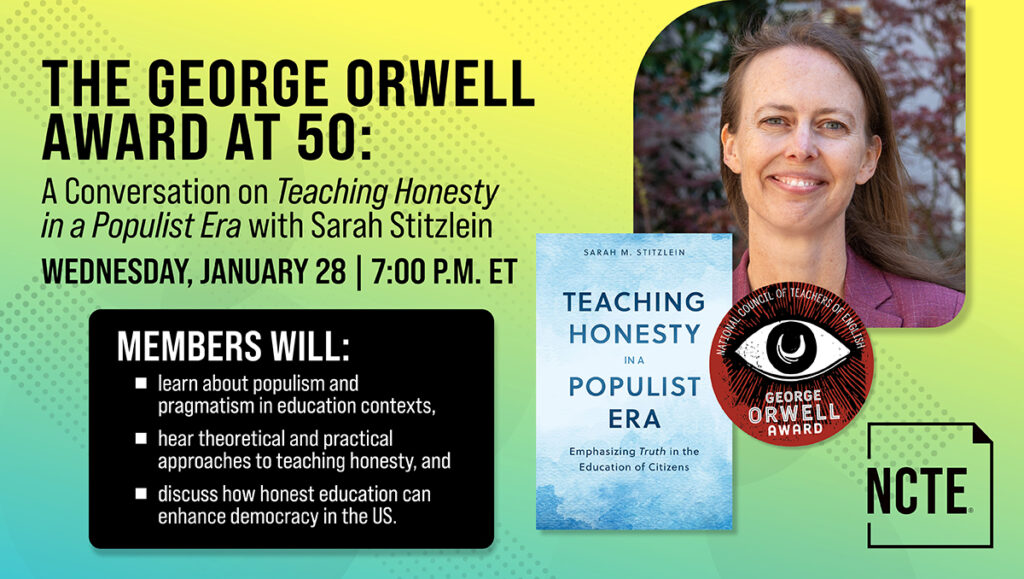 In celebration of the 50th anniversary of NCTE’s George Orwell Award, which honors creators of work that contributes to honesty and clarity in public language, NCTE invites you to a special webinar series where you can hear directly from winners of this prestigious award.