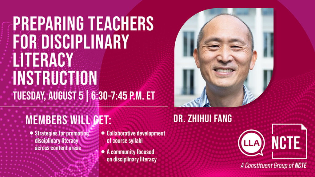 Literacies and Languages for All (LLA) invites NCTE members to join an interactive session focused on disciplinary literacy instruction in teacher education. Dr. Zhihui Fang, professor of language and literacy education in the School of Teaching and Learning at the University of Florida, and author of Demystifying Academic Reading: A Disciplinary Literacy Approach to Reading Across Content Areas, will highlight assignments, activities, and resources that he has found valuable in preparing K–12 teachers for disciplinary literacy instruction.