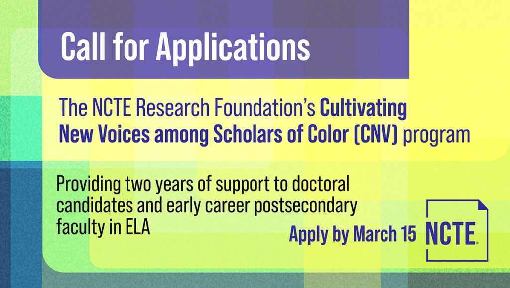 The NCTE Research Foundation’s Cultivating New Voices among Scholars of Color (CNV) program is first and foremost a mentoring program. It brings early career scholars of color (both doctoral candidates and early career postsecondary faculty) into a two-year experience grounded in close guidance, relationship building, and support. Through one-on-one and group mentoring, CNV helps doctoral candidates and early career faculty draw from their cultural and linguistic knowledge as they design, conduct, and share their research. Fellows join a community where they can learn with and from established scholars, build networks that sustain their growth, and strengthen their identities as researchers. Learn more about their activities.