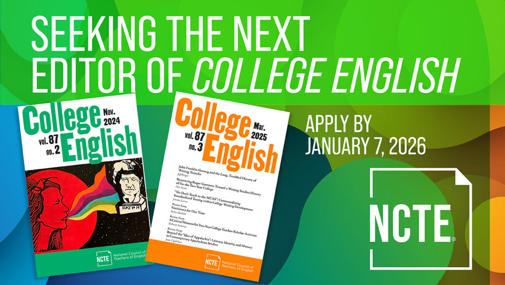 NCTE is seeking the next editor(s) of the journal College English. In July 2027, the term of the present editor (Lori Ostergaard) and associate editors (Felicita Arzu Carmichael, Jim Nugent, and Megan Schoen) will end. Interested persons/teams should submit an application, available here, by no later than January 7, 2026.