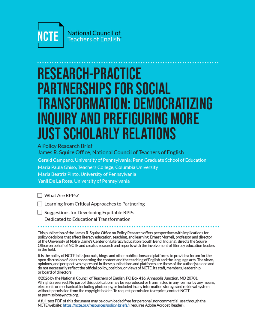 The NCTE James R. Squire Office of Policy Research in English Language Arts publishes policy briefs that explore key issues impacting literacy educators and their students and articulate student-centered policy recommendations.