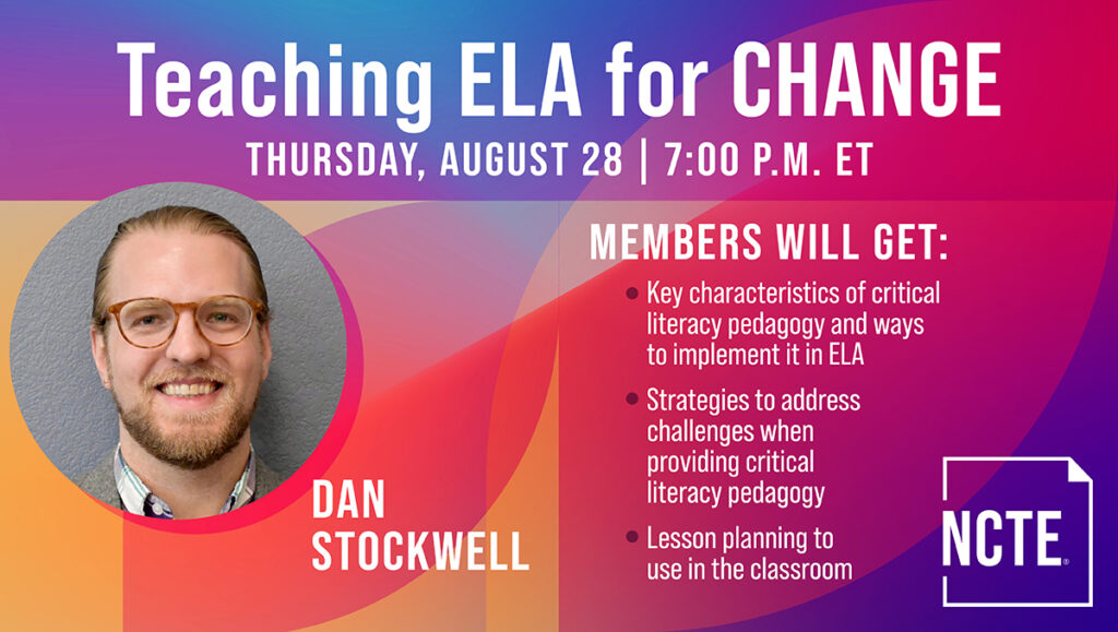 NCTE’s Secondary Section invites members to join Secondary Section Steering Committee member Dan Stockwell for this special webinar. Dan will share findings from his qualitative research study to encourage secondary preservice and inservice teachers to provide critical literacy pedagogy as they teach ELA and use their instruction to support students in reading and writing the world. The session will provide specific examples of ways teachers can implement critical literacy pedagogy in their teaching and provide strategies for addressing concerns about parental or administrative pushback and backlash.